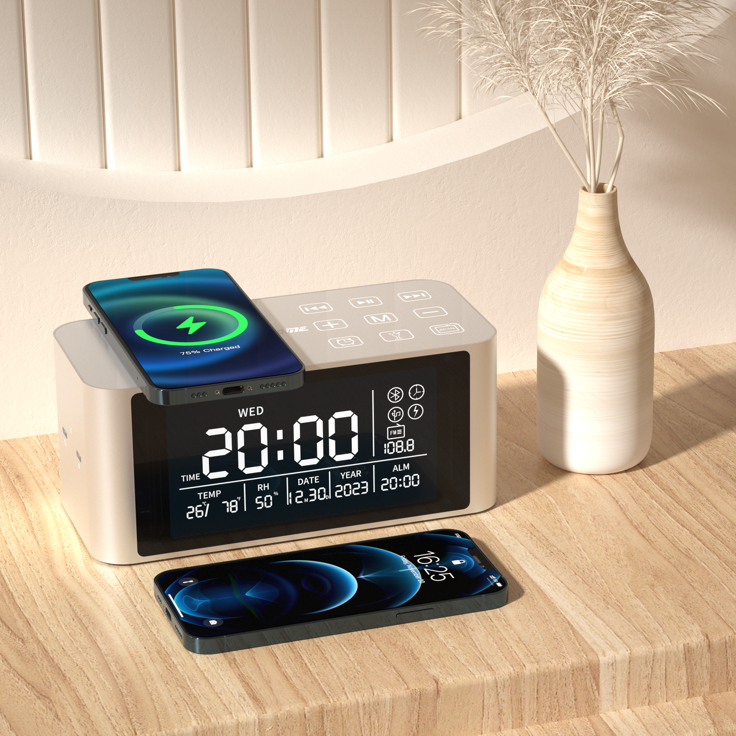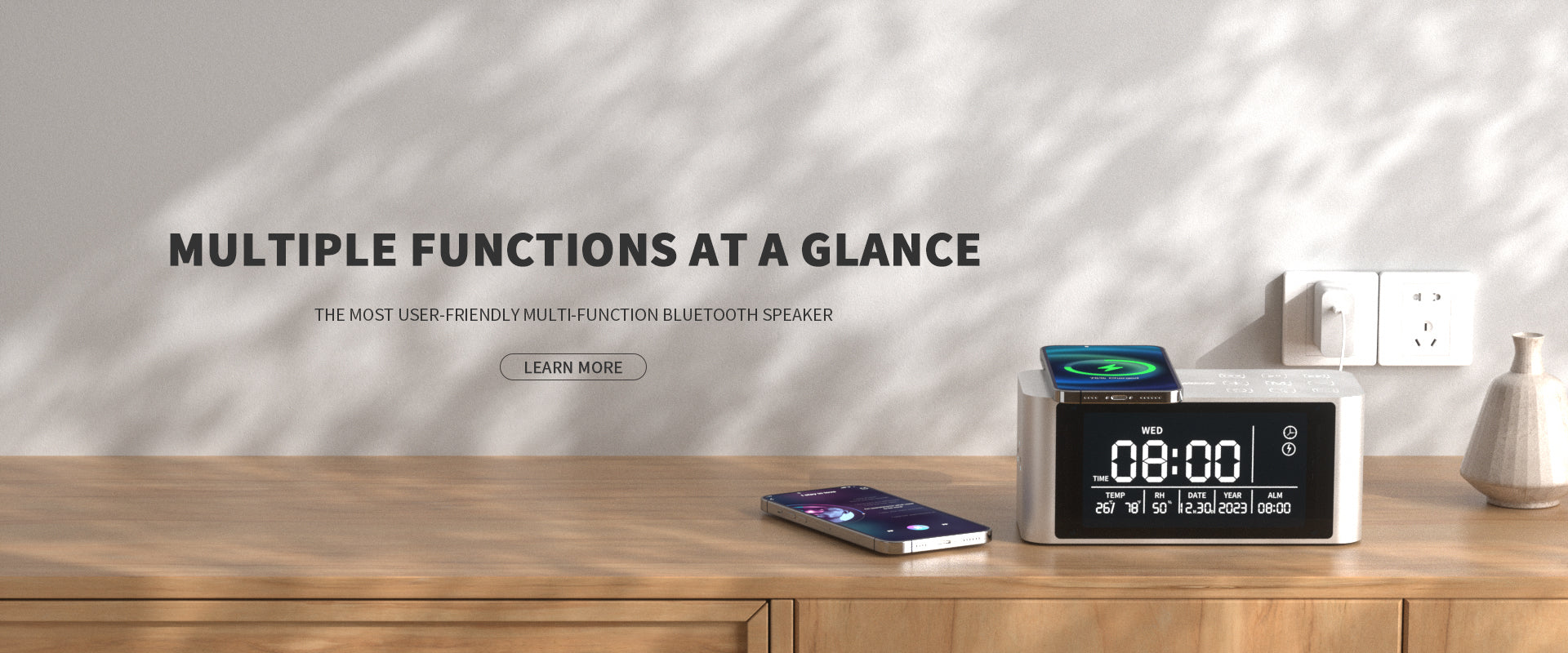 This is a Bluetooth speaker with wireless charging, smart alarm clock, radio playback, and more functions, greatly enhancing your daily life convenience.